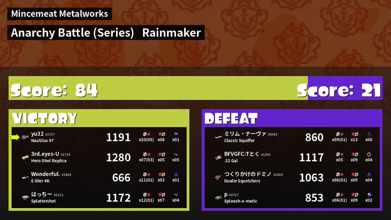 | Medals | #1 Overall Splatter #1 Popular Target #1 Enemy Splatter | ||