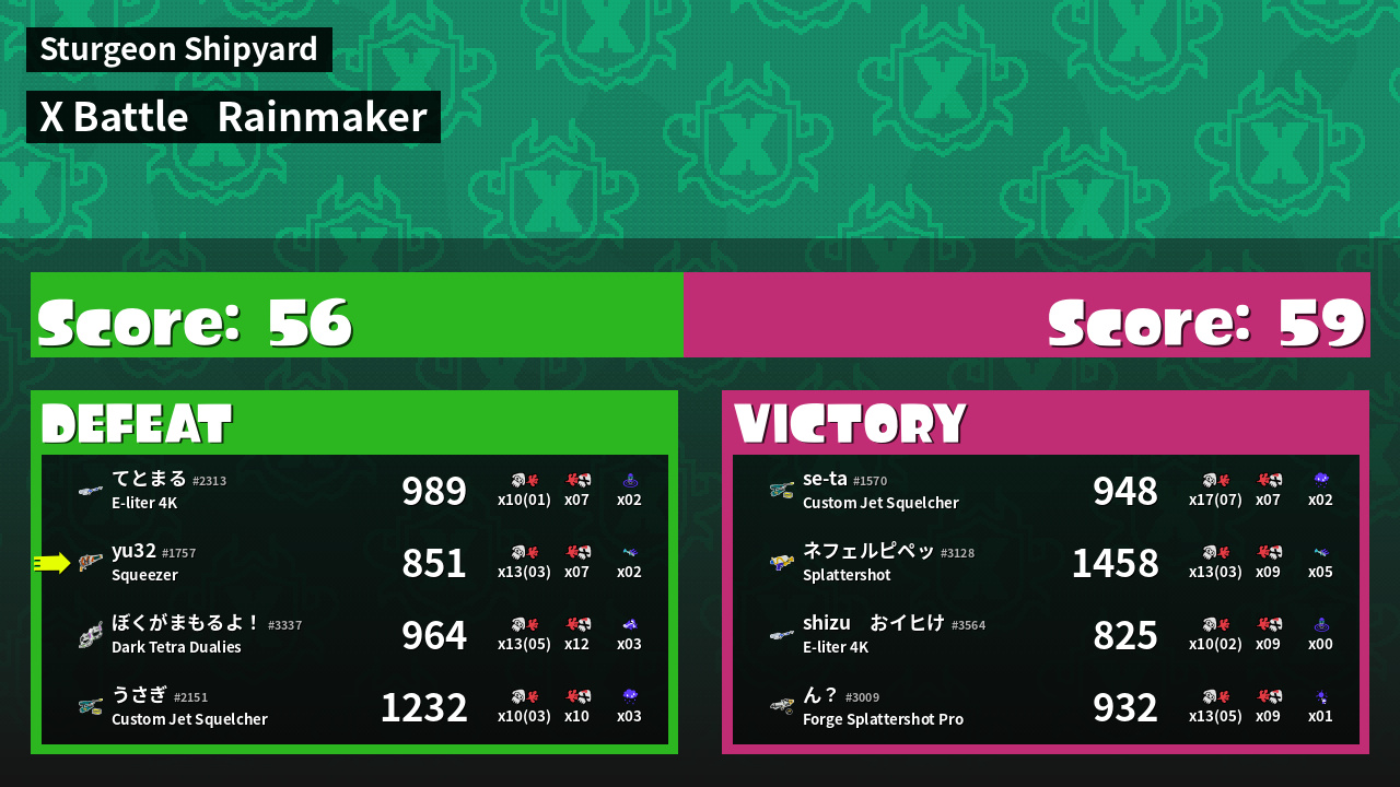 | Medals | #1 Overall Splatter #1 Enemy Splatter #1 Rainmaker Stopper | ||