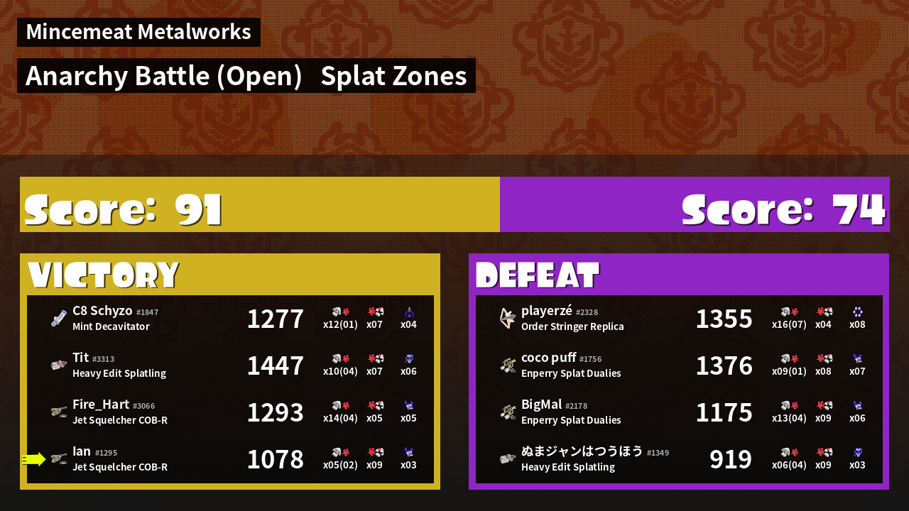 | Mode | Splat Zones - Anarchy Battle (Open) | ||