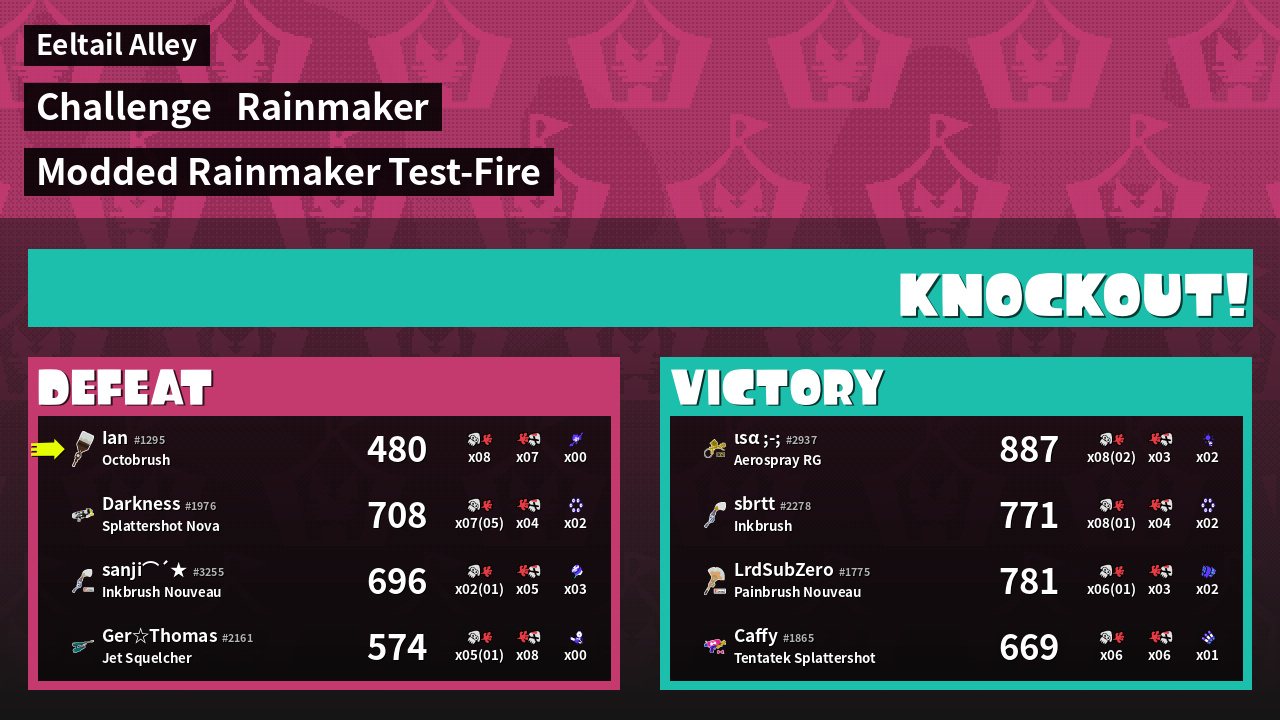 Kills / Deaths | 8 + 0 / 7 > Kill Ratio: 1.14 | ||