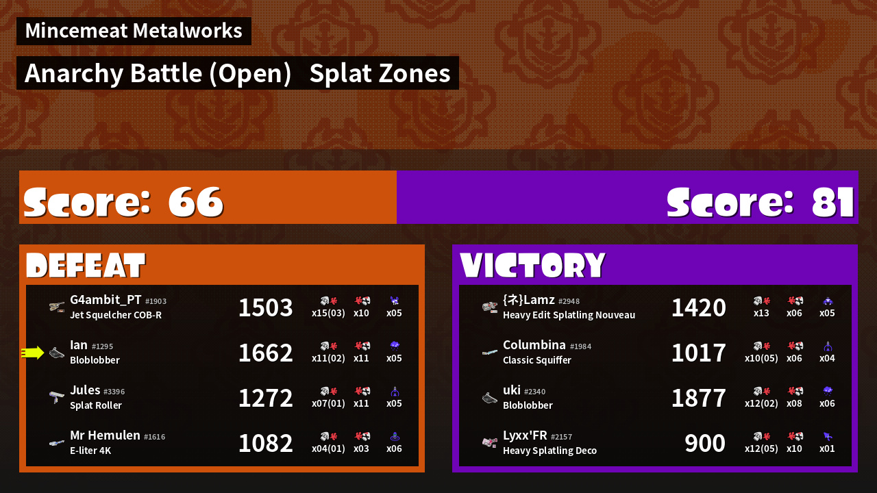 | Mode | Splat Zones - Anarchy Battle (Open) | ||