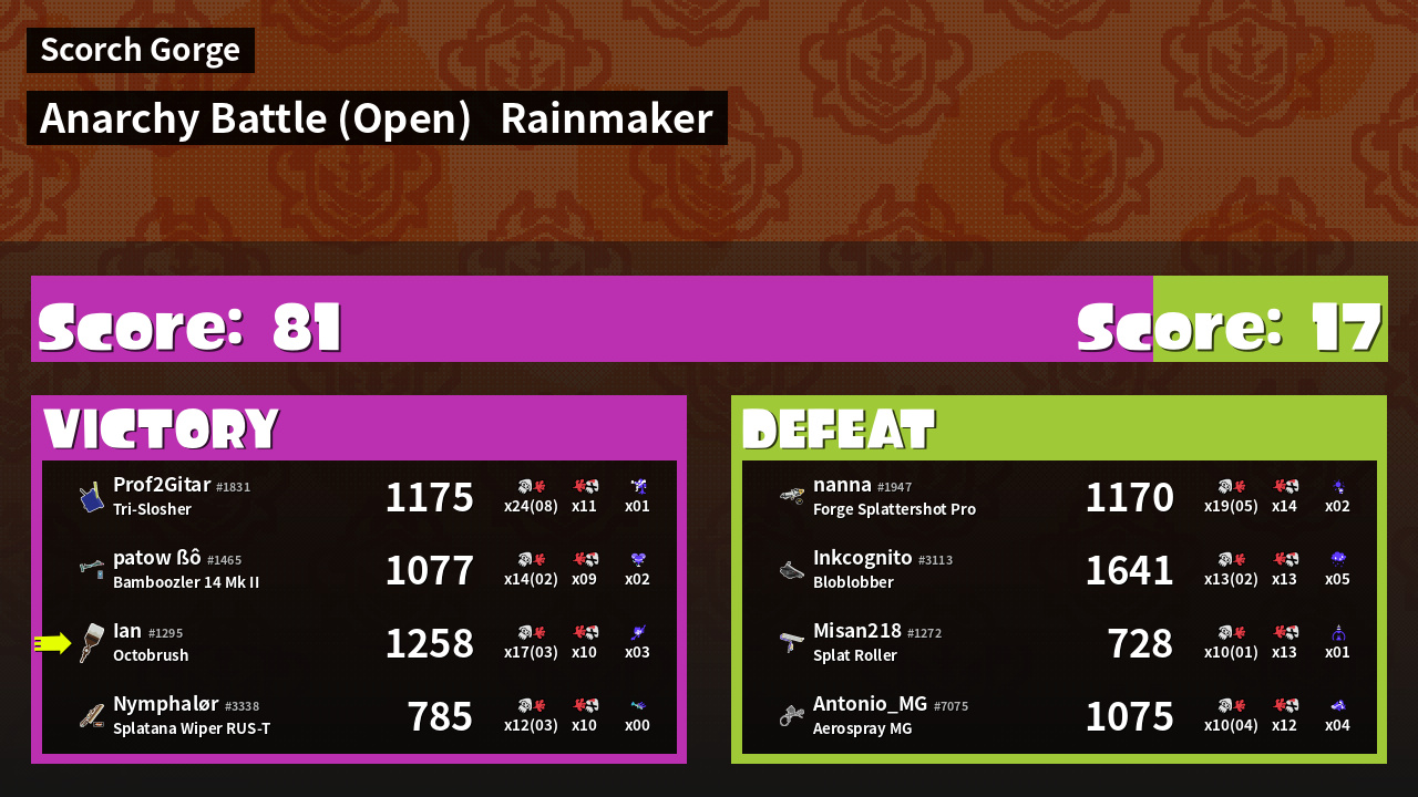 Kills / Deaths | 14 + 3 / 10 > Kill Ratio: 1.40 | ||