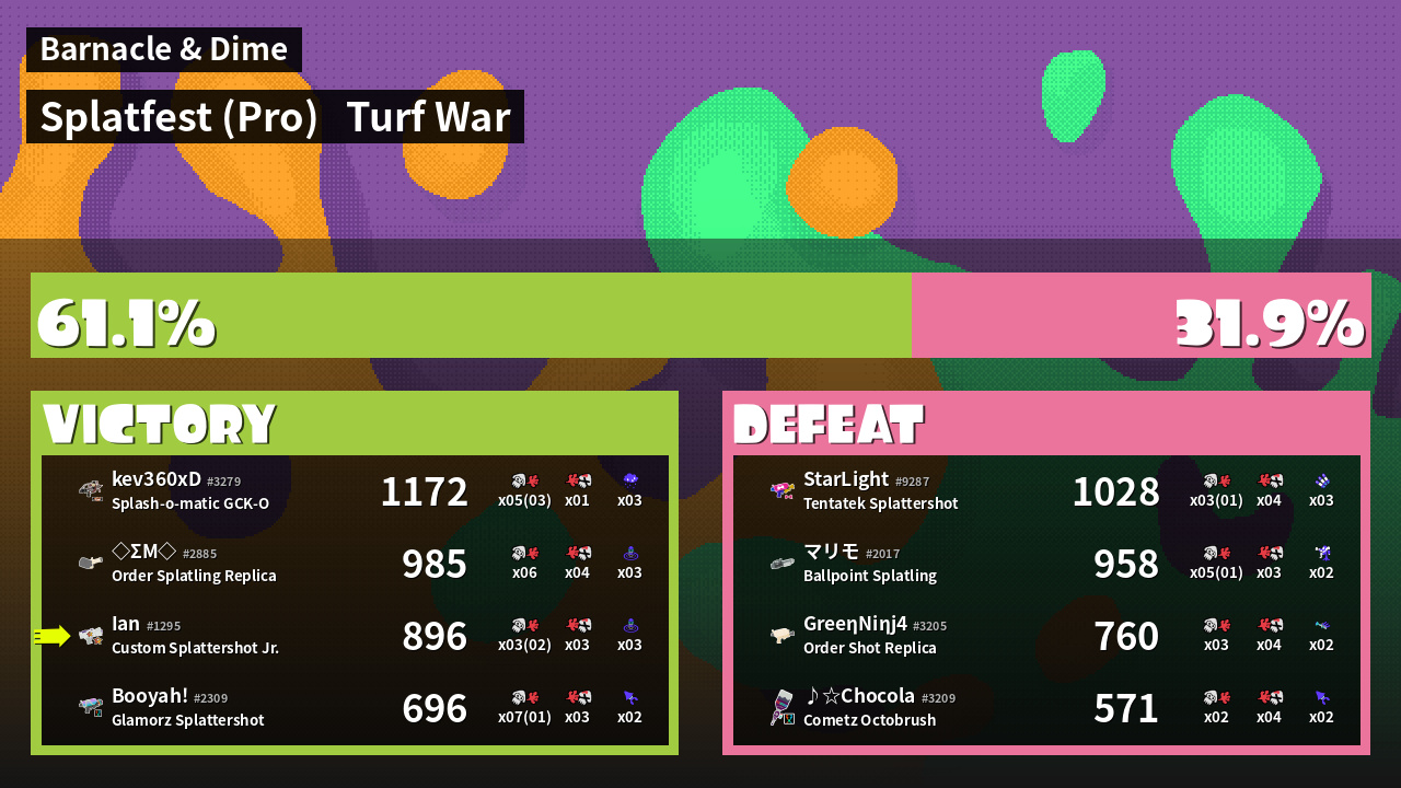 | Medals | #1 Ink Consumer #1 Wave Breaker User #2 Enemy-Base Inker | ||