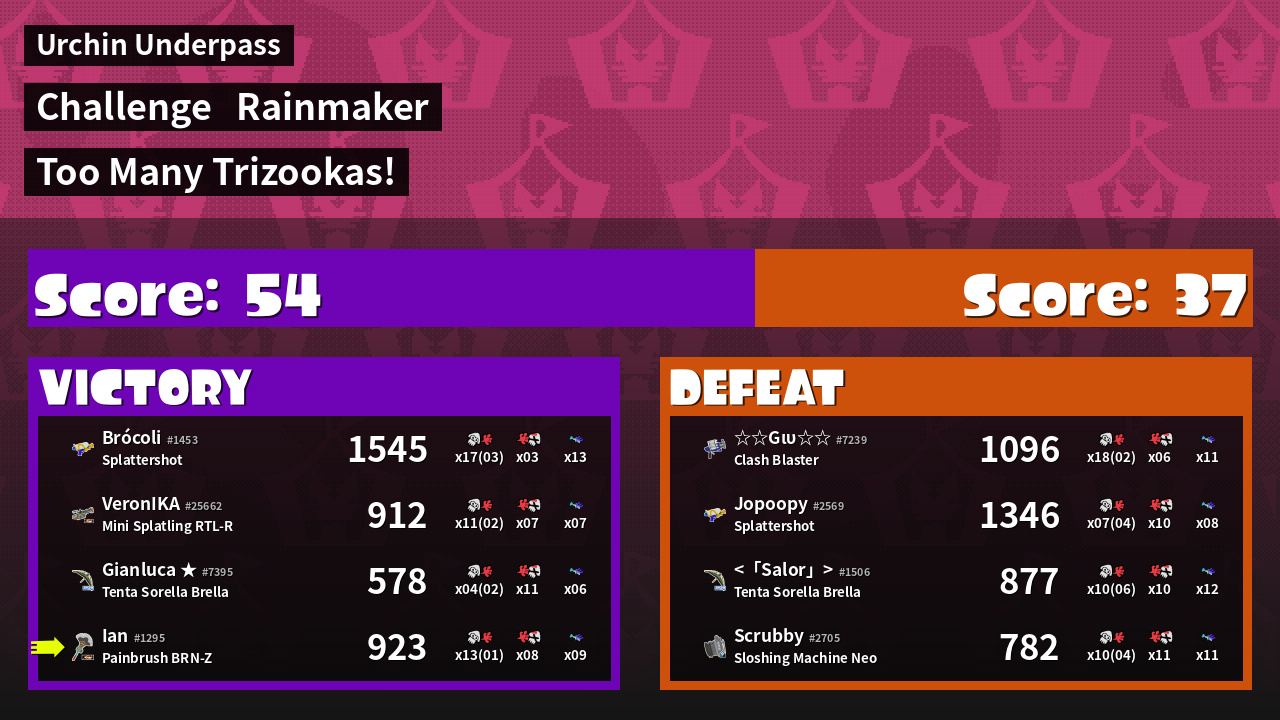 | Medals | #1 Rainmaker Stopper #1 Trizooka User #2 Overall Splatter | ||