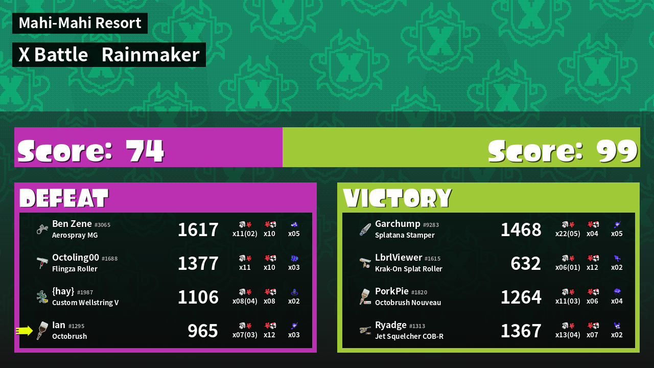 | Medals | #1 Ground Traveler #1 Ink Consumer #2 Splat Assister | ||
