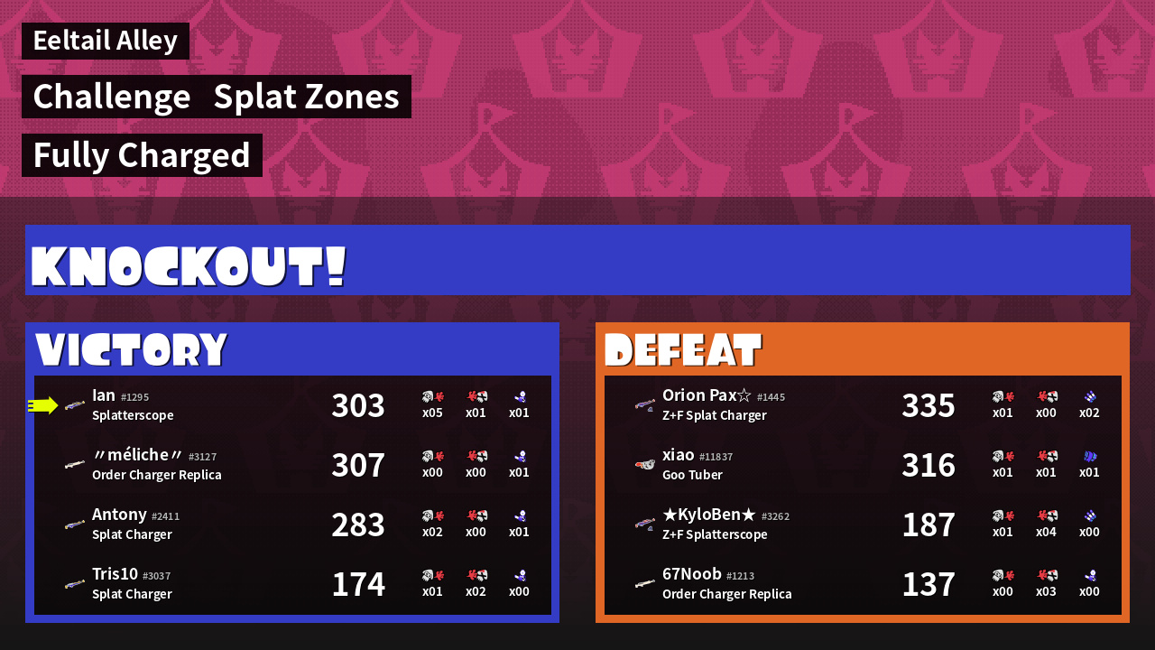 | Medals | #1 Overall Splatter #1 Splat Zone Guard #1 Enemy Splatter | ||