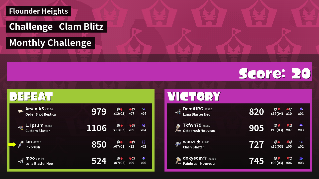| Medals | #1 Ink Consumer #1 Killer Wail 5.1 User #2 Clam Carrier | ||