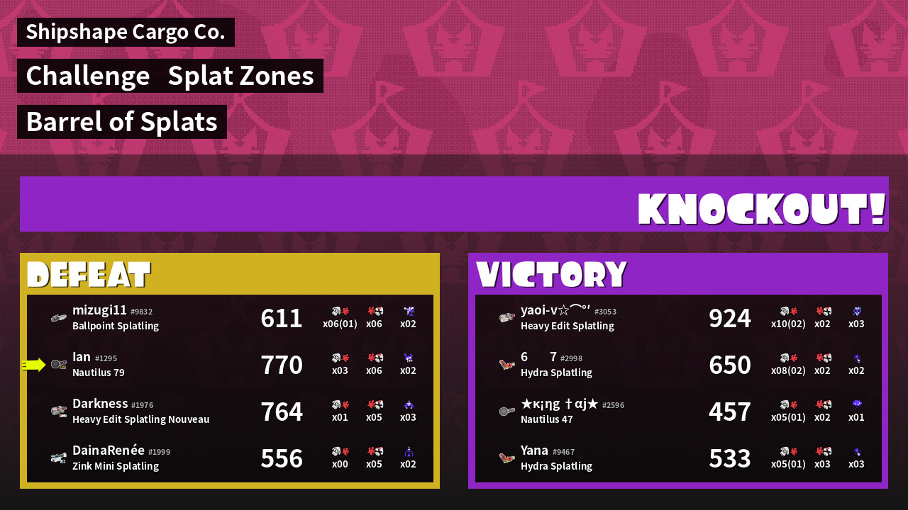 Challenge | Barrel of Splats Muster as much firepower as you can<br />in this battle of the splatlings! | ||