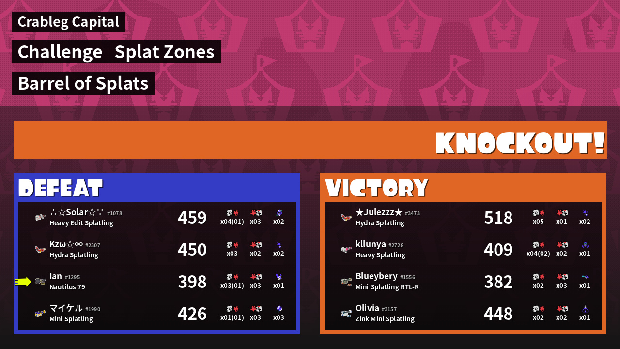 Challenge | Barrel of Splats Muster as much firepower as you can<br />in this battle of the splatlings! | ||