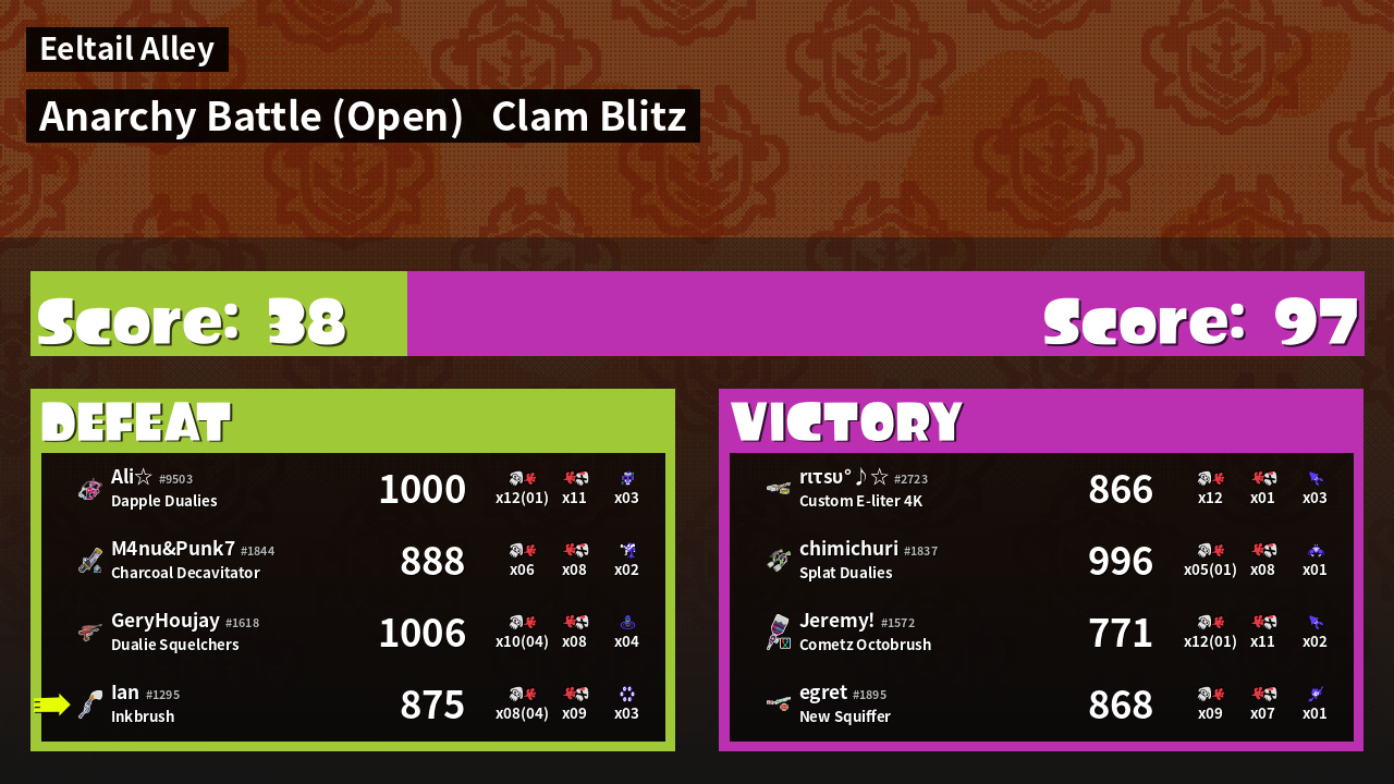 | Mode | Clam Blitz - Anarchy Battle (Open) | ||