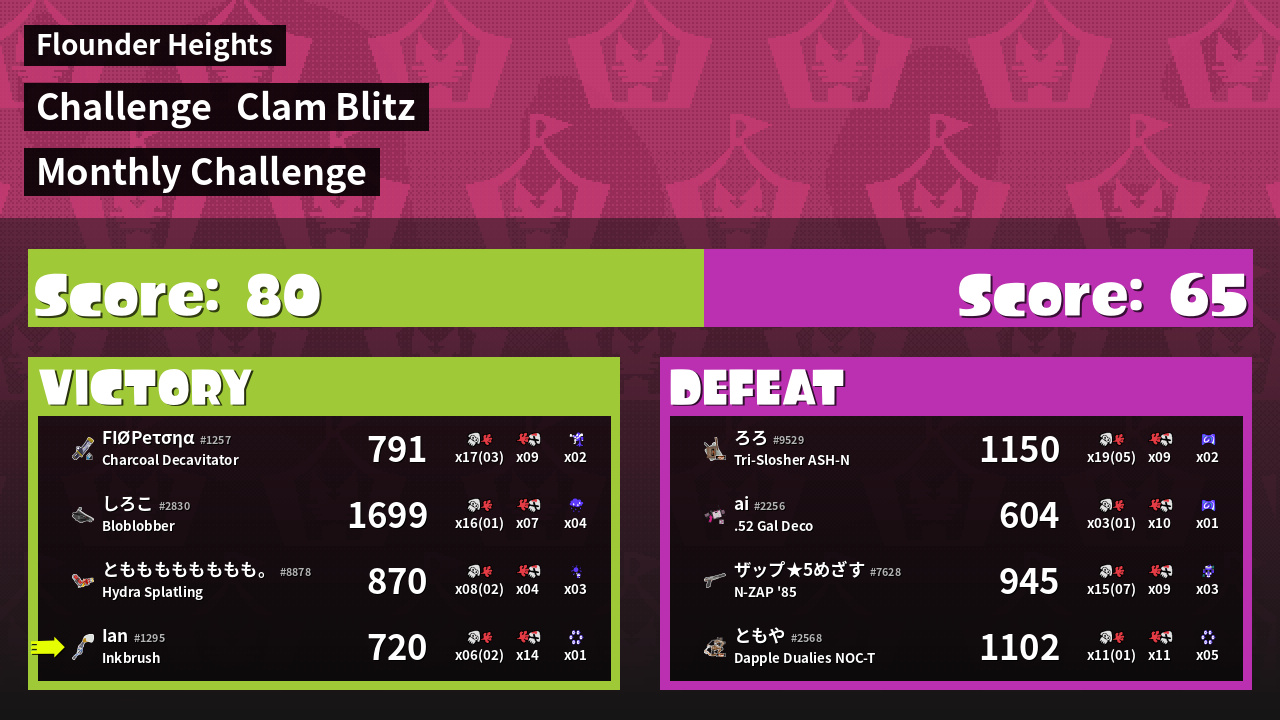 | Medals | #1 Super Jump Spot #1 Ground Traveler #2 Splat Assister | ||