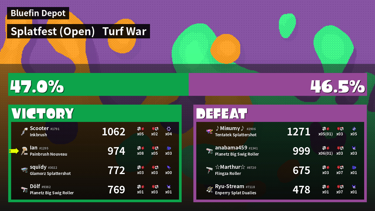 | Medals | #1 Overall Splatter #1 Popular Target #1 Enemy-Base Inker | ||