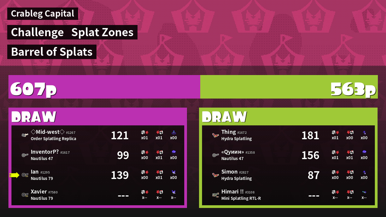 Challenge | Barrel of Splats Muster as much firepower as you can<br />in this battle of the splatlings! | ||