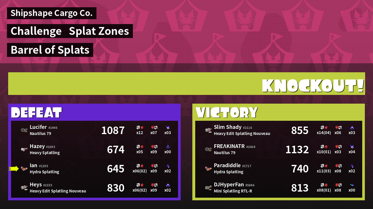Challenge | Barrel of Splats Muster as much firepower as you can<br />in this battle of the splatlings! | ||
