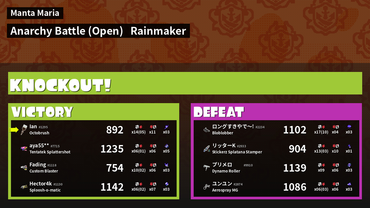 | Medals | #1 Overall Splatter #1 Enemy Splatter #1 Splat Assister | ||
