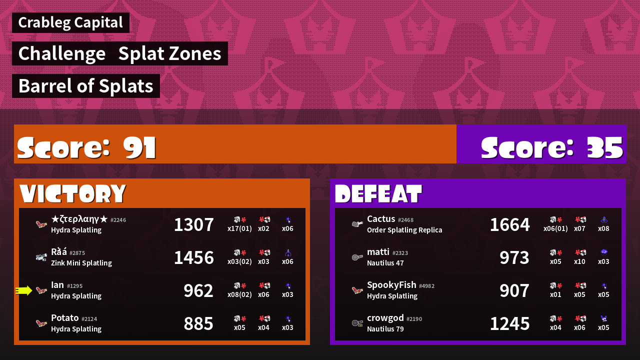 Challenge | Barrel of Splats Muster as much firepower as you can<br />in this battle of the splatlings! | ||