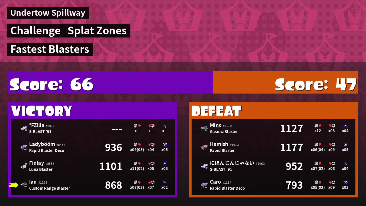 | Medals | #1 Popular Target #2 Splat Zone Guard #2 Splat Assister | ||