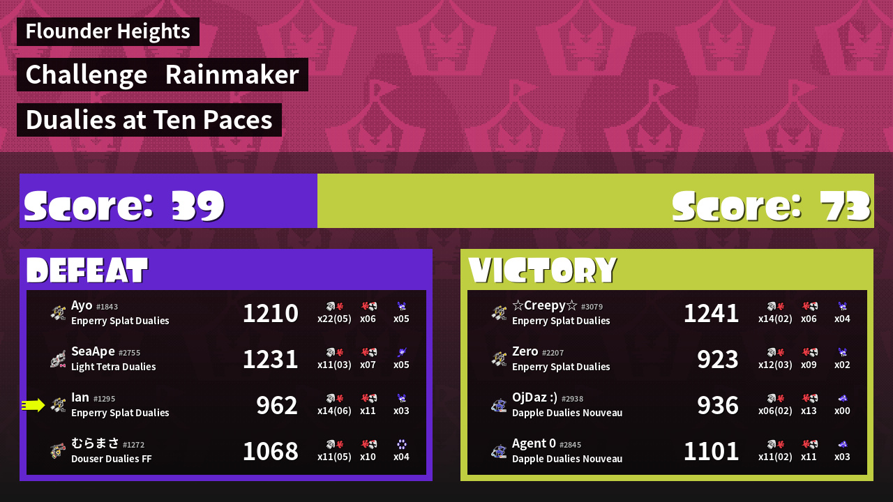 | Weapon | Enperry Splat Dualies ( Curling Bomb / Triple Splashdown) | ||