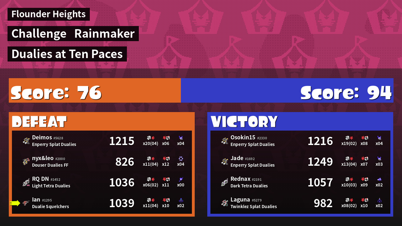 | Medals | #1 Splat Assister #1 Ink Consumer #1 Wave Breaker User | ||
