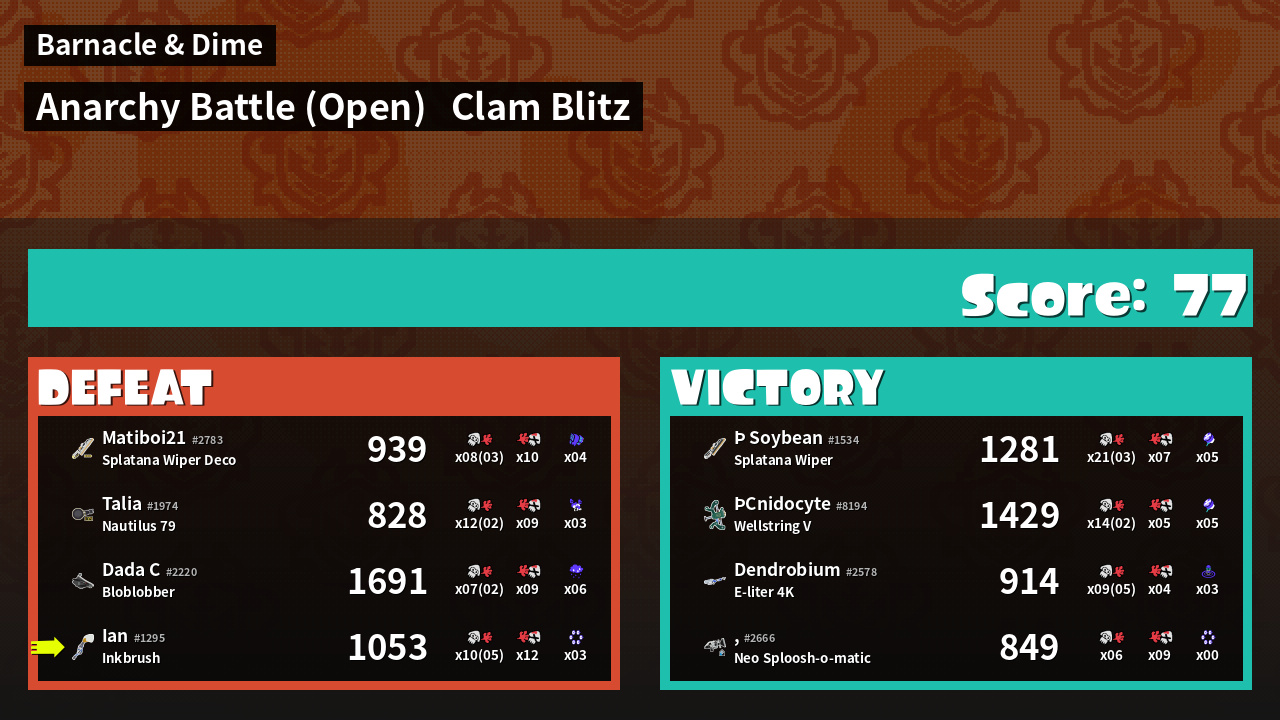| Mode |  Clam Blitz -  Anarchy Battle (Open) | ||
