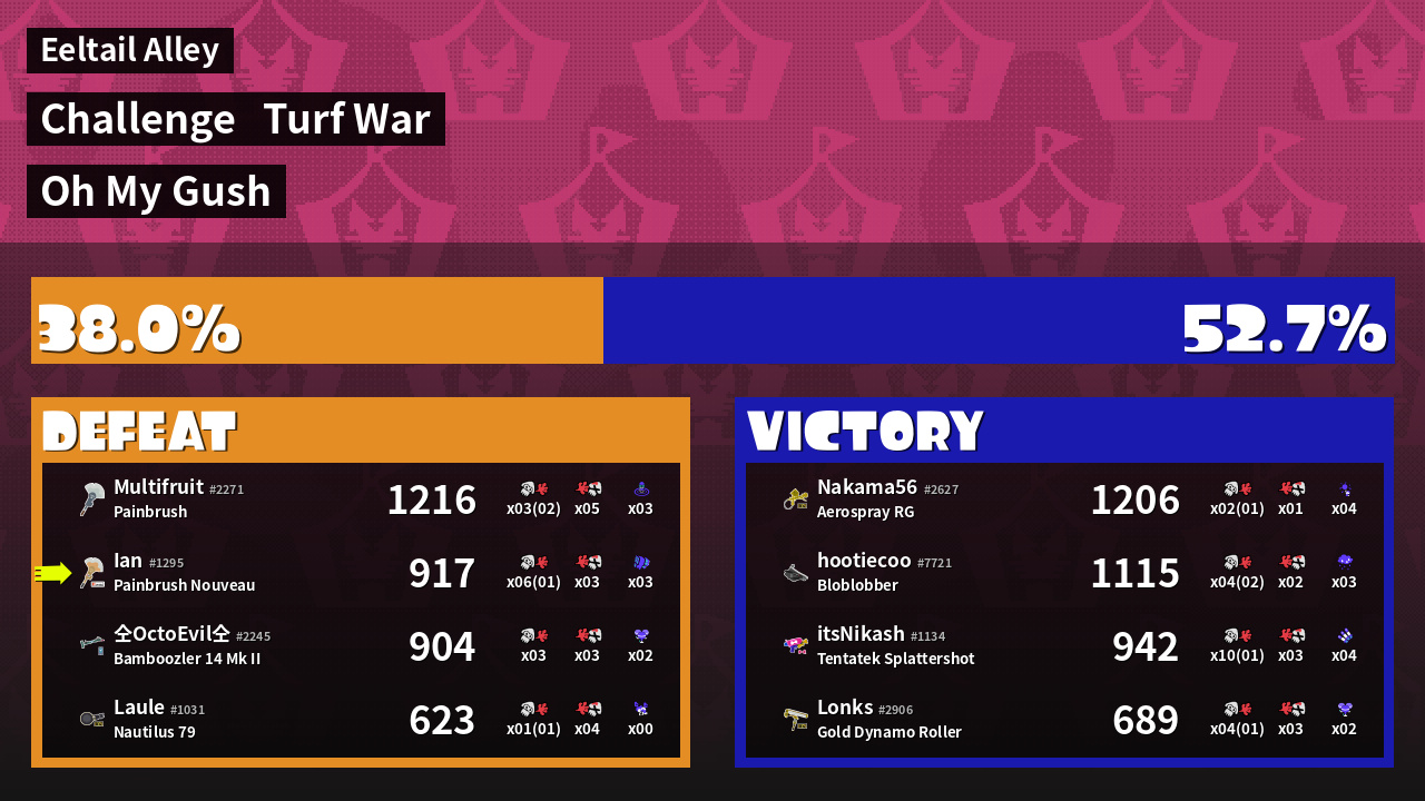 | Medals | #1 Overall Splatter #1 Enemy-Base Inker #1 Enemy Splatter | ||