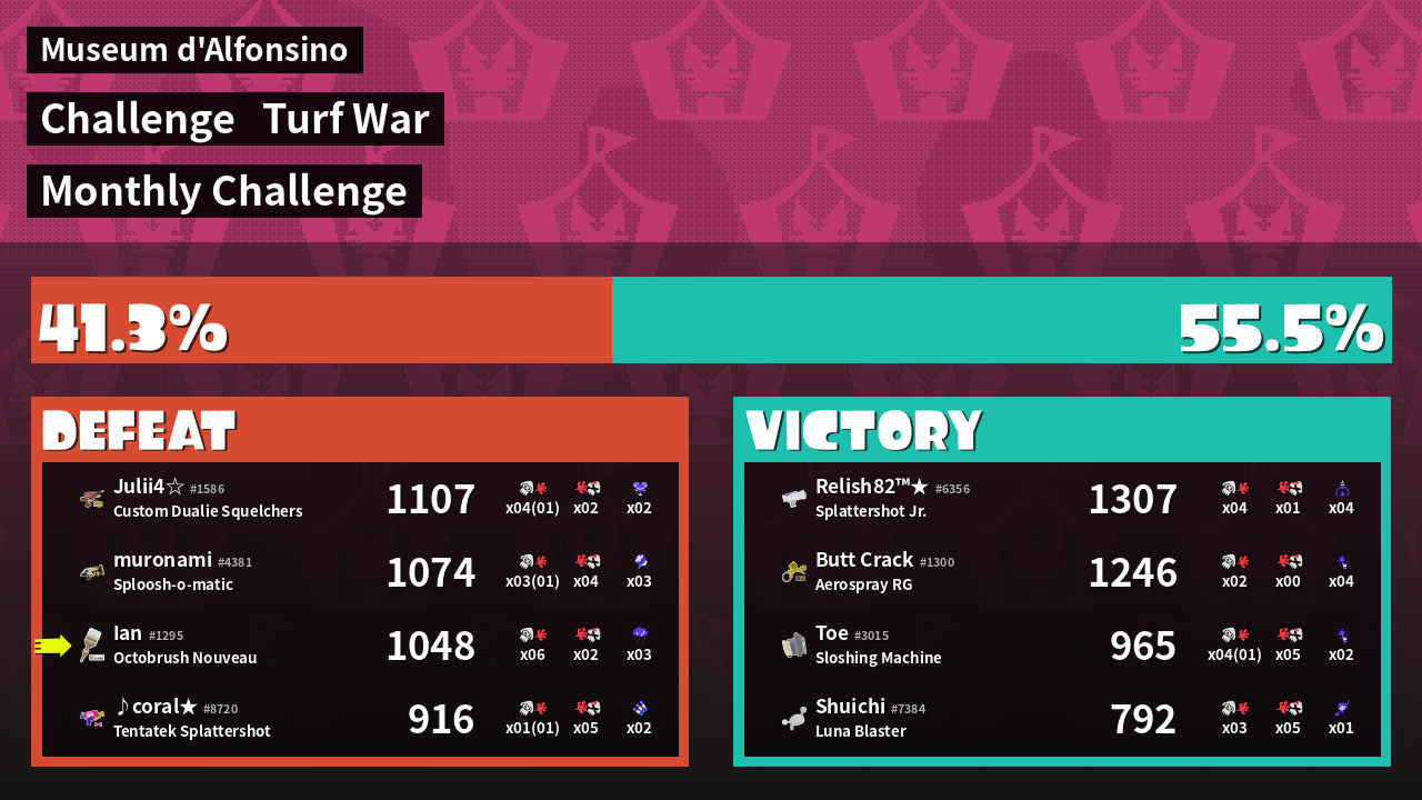 | Medals | #1 Overall Splatter #1 Popular Target #1 Super Jump Spot | ||