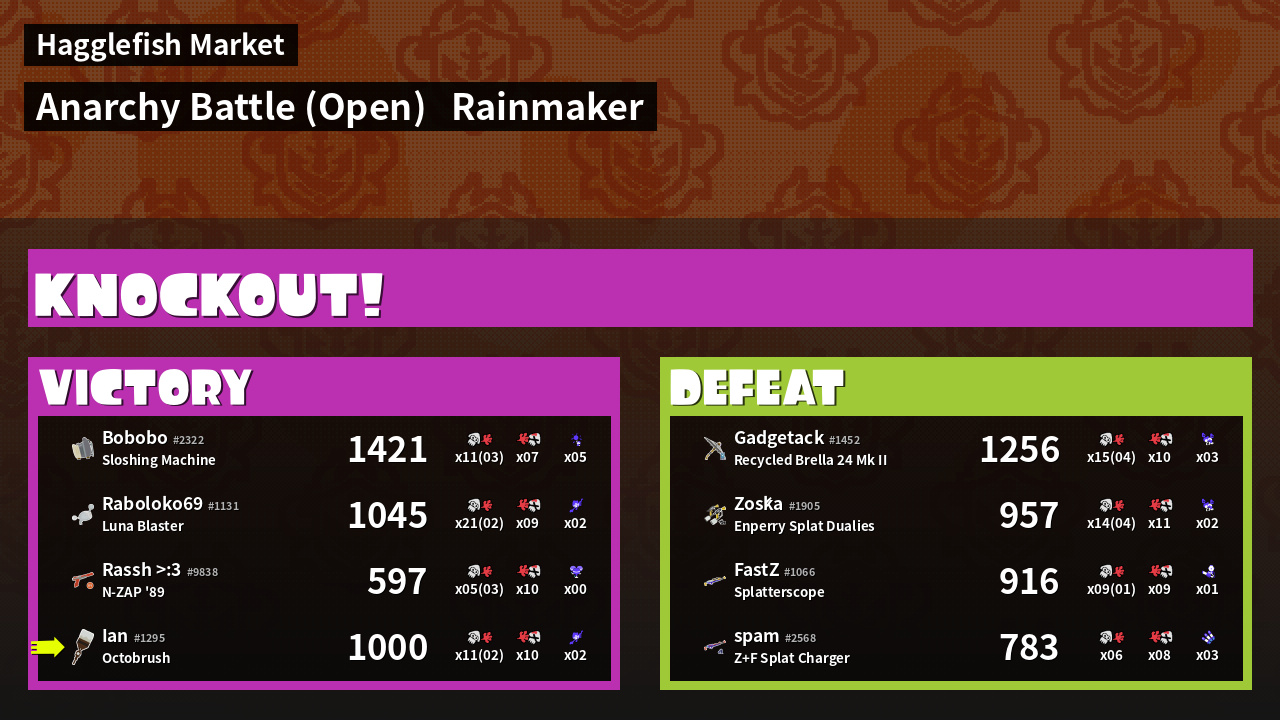 | Medals | #1 Ink Consumer #1 Zipcaster User #2 Overall Splatter | ||