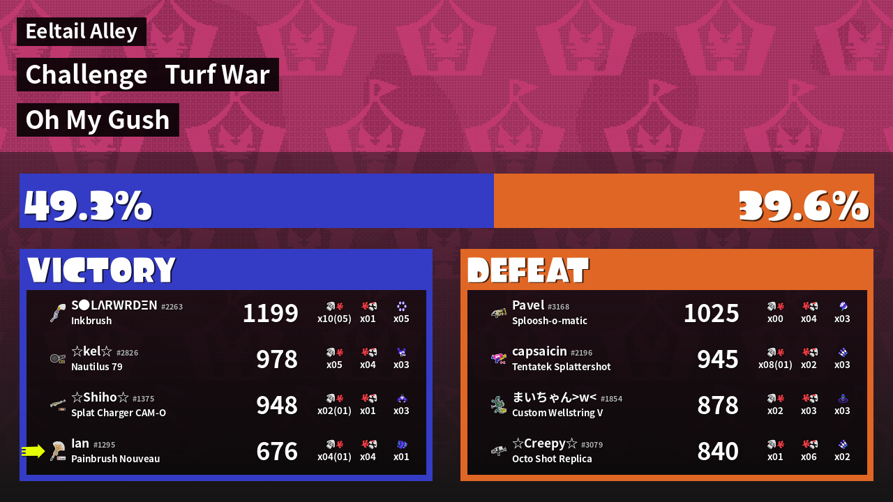 | Medals | #1 Enemy-Base Inker #2 Splat Assister | ||