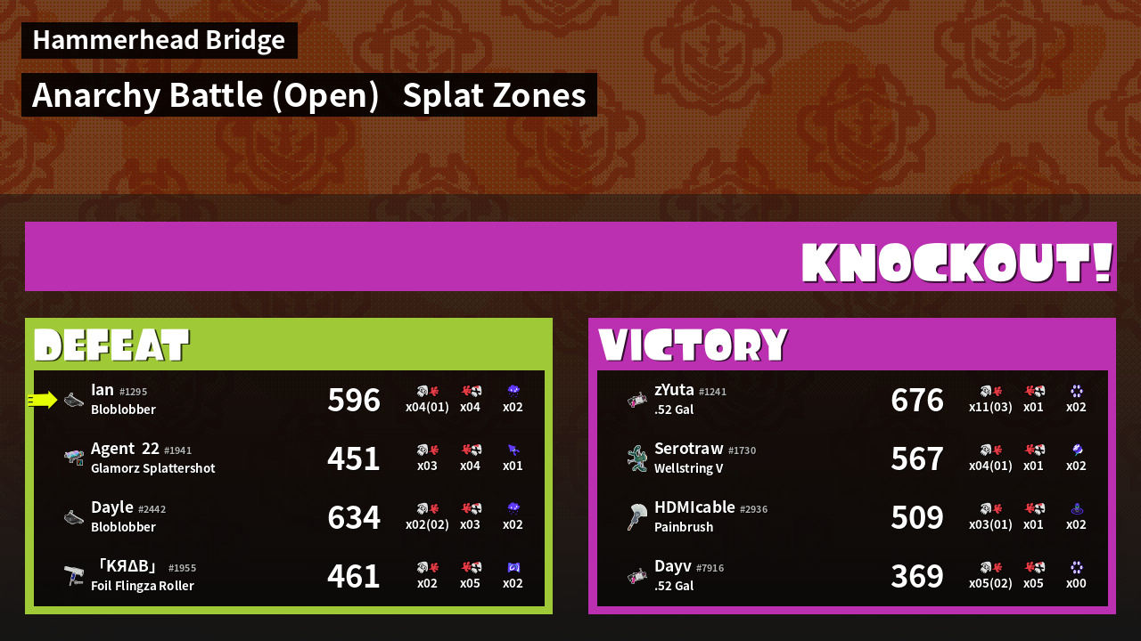 | Mode | Splat Zones - Anarchy Battle (Open) | ||