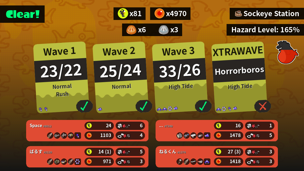 | Weapons | Grizzco Splatana Nautilus 47 Aerospray MG Splash-o-matic | Octobrush Grizzco Splatana Classic Squiffer Goo Tuber | Sloshing Machine L-3 Nozzlenose Splattershot Jr. .96 Gal | Grizzco Splatana Explosher Mini Splatling Grizzco Splatana |