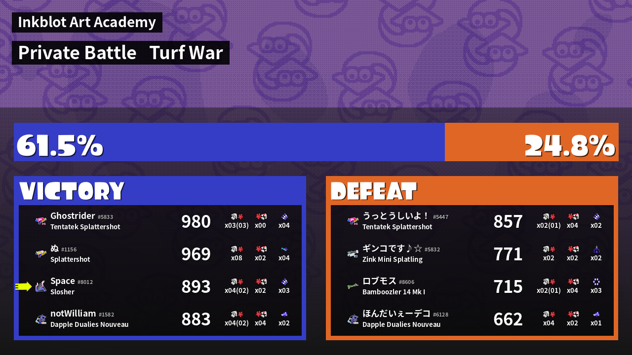 | Medals | #1 Super Jump Spot #2 Overall Splatter #2 Enemy-Base Inker | ||