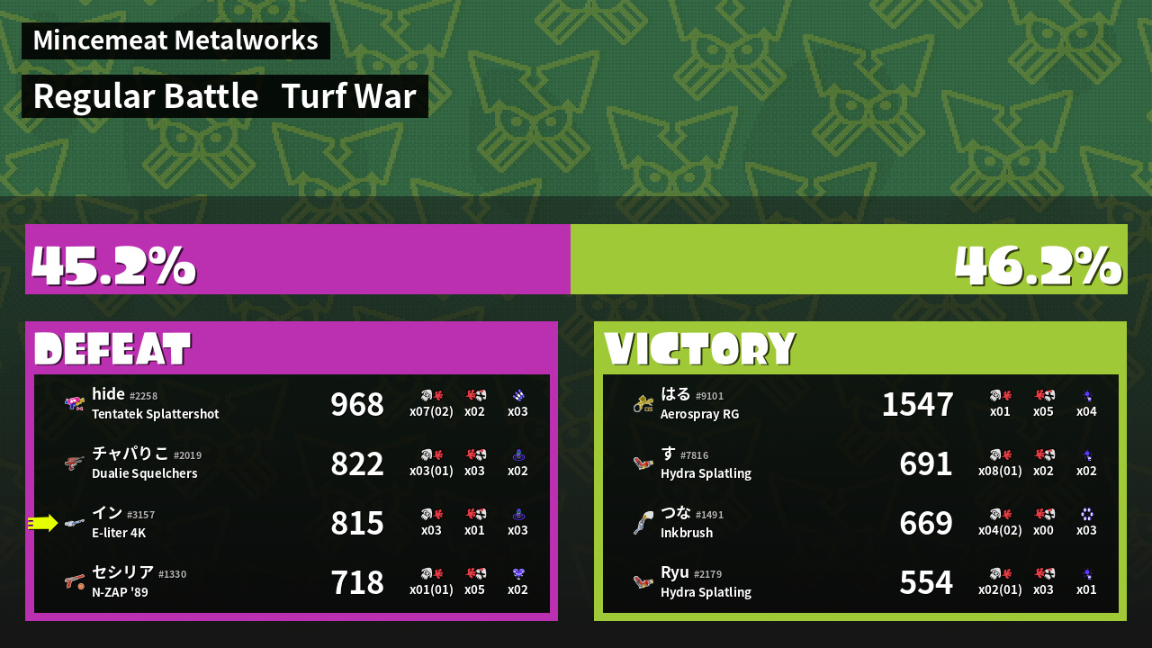 | Medals | #1 Enemy-Base Inker #1 Super Jump Spot #2 Overall Splatter |