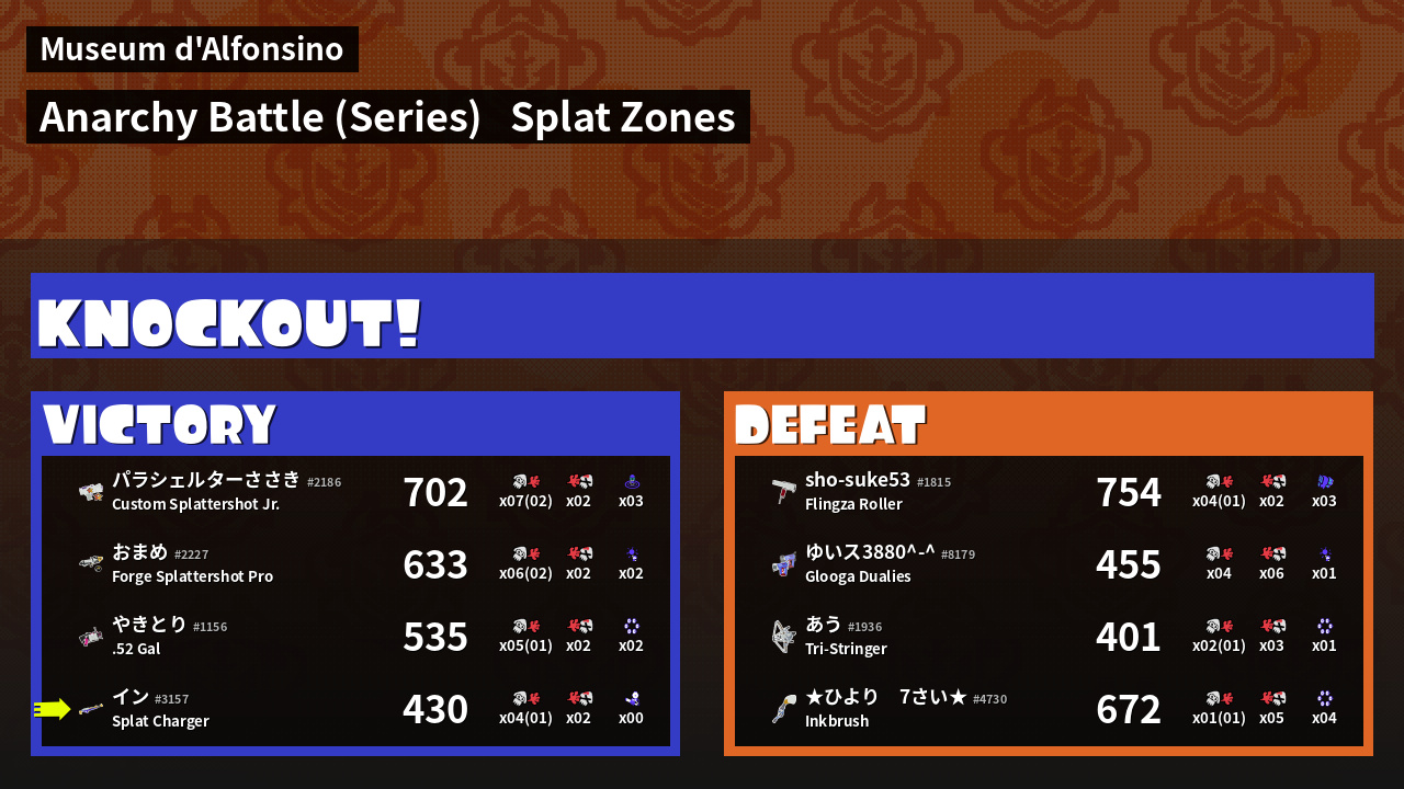 | Medals | #1 Splat Zone Hero #2 Splat Zone Inker | ||