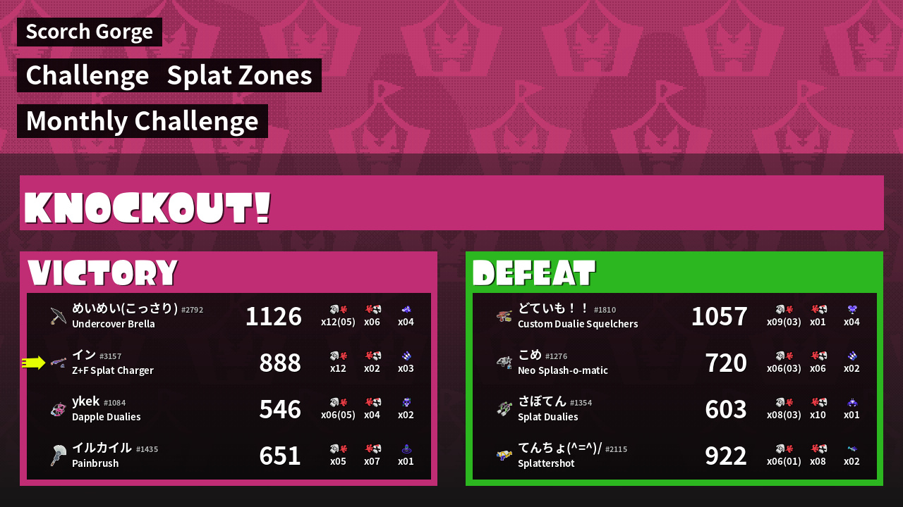 | Medals | #1 Overall Splatter #1 Enemy Splatter #1 Triple Inkstrike User | ||