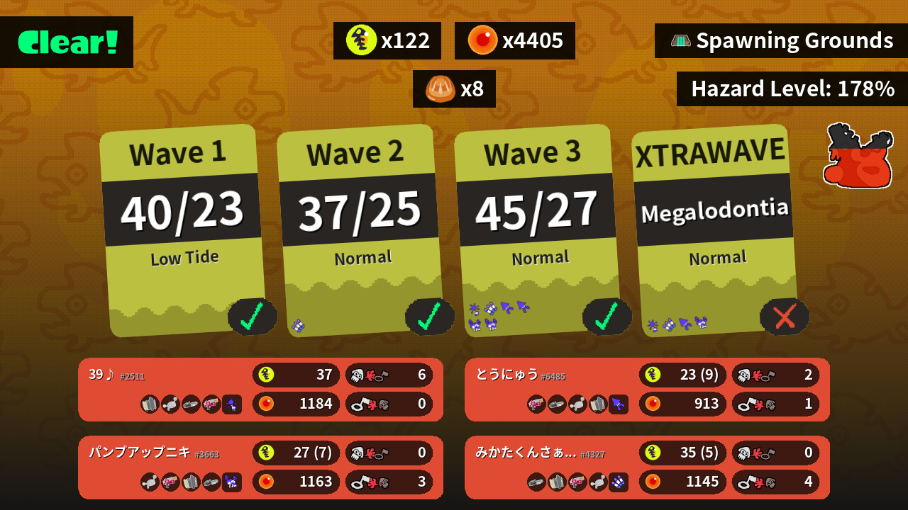 | Weapons | Sloshing Machine Luna Blaster Ballpoint Splatling Rapid Blaster | Ballpoint Splatling Sloshing Machine Rapid Blaster Luna Blaster | Luna Blaster Rapid Blaster Sloshing Machine Ballpoint Splatling | Rapid Blaster Ballpoint Splatling Luna Blaster Sloshing Machine |