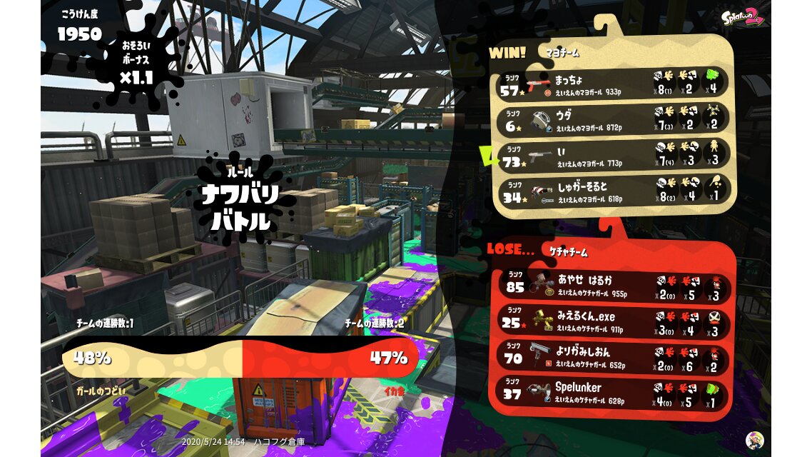 | Team ケチャ イカ会 Win Streak: 2 | 3,146 | 11 / 20 | 0.55 35.48% | ||||