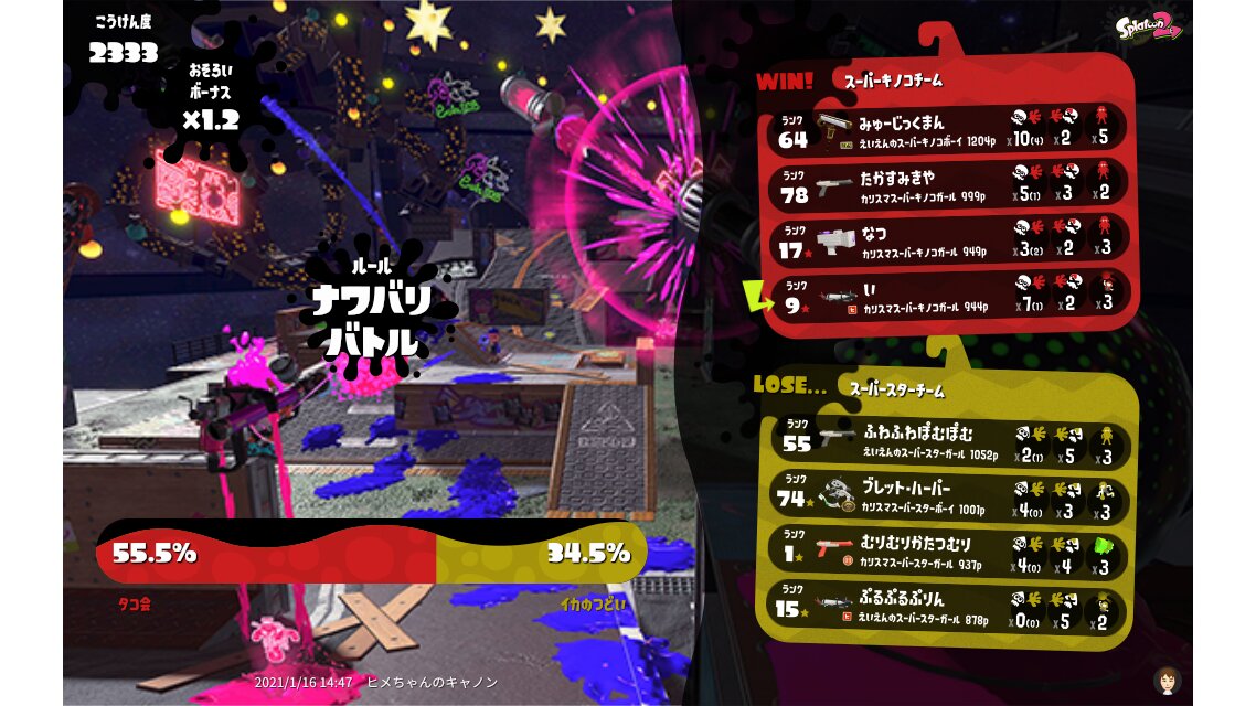 | Team スーパースター イカのつどい Win Streak: 0 | 3,868 | 9 / 17 | 0.53 34.62% | ||||