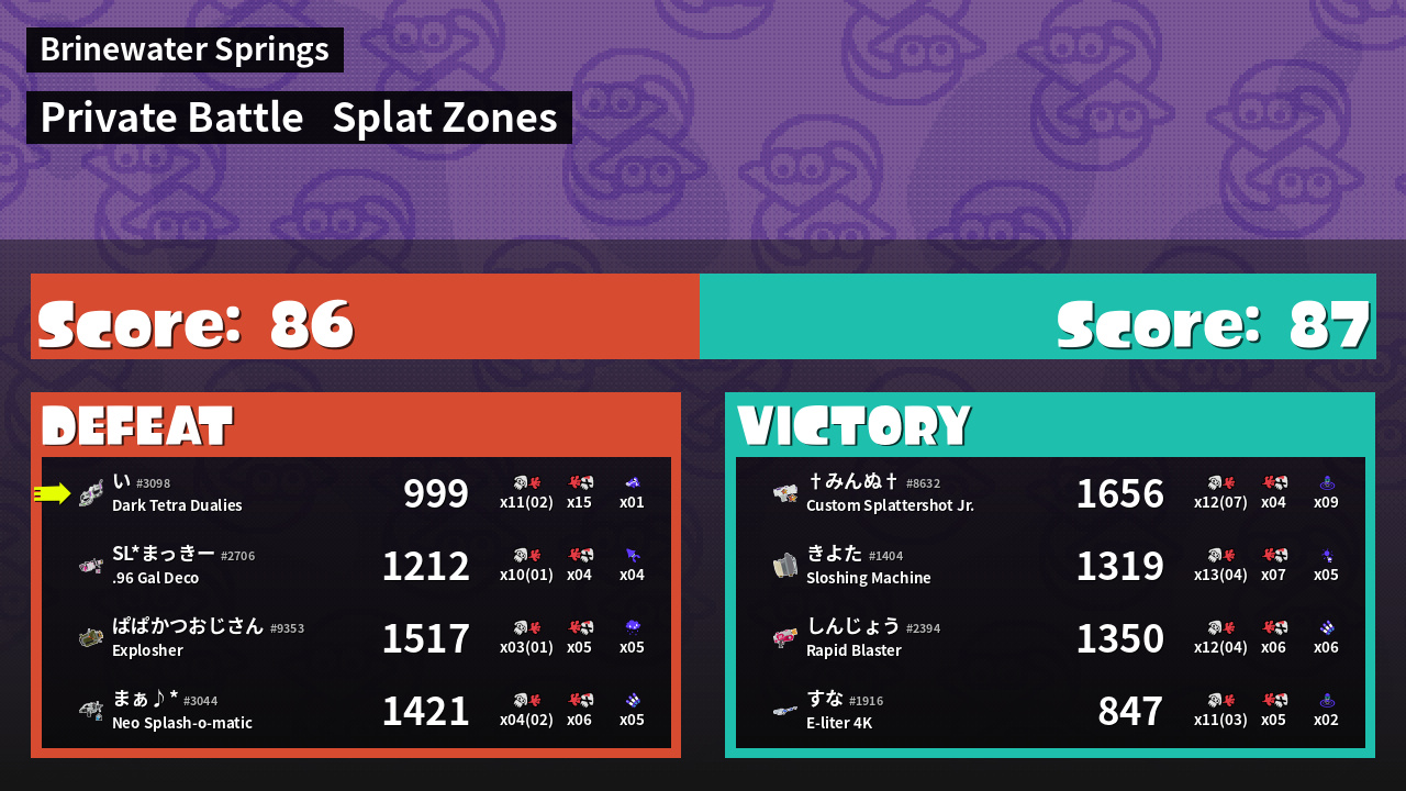 | Medals | #1 Overall Splatter #1 Splat Zone Guard #1 Enemy Splatter | ||