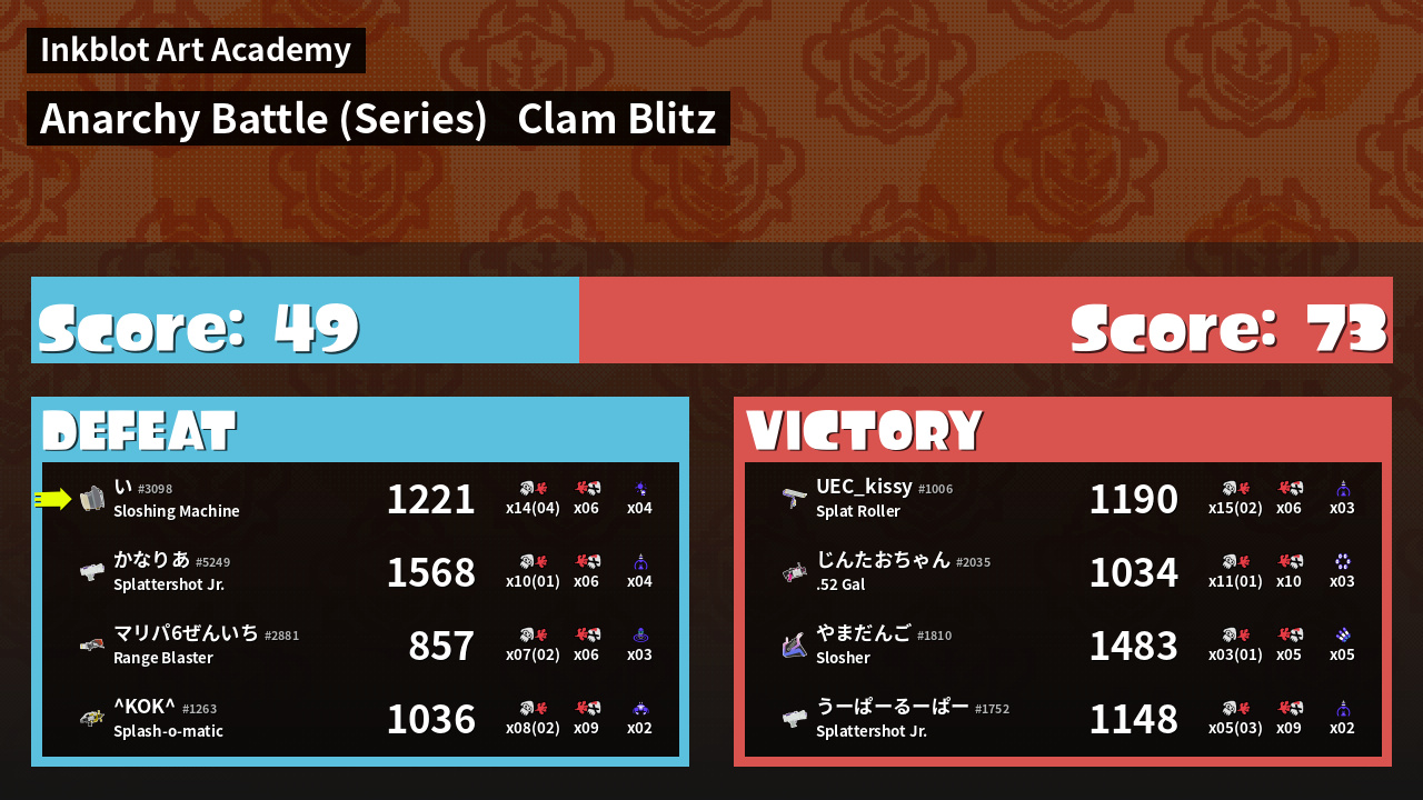 | Swoon-Worthy Artist UEC_kissy #1006 |  Splat Roller     | 1,190 | 13 + 2 | 6 | 2.17 |  3 | |