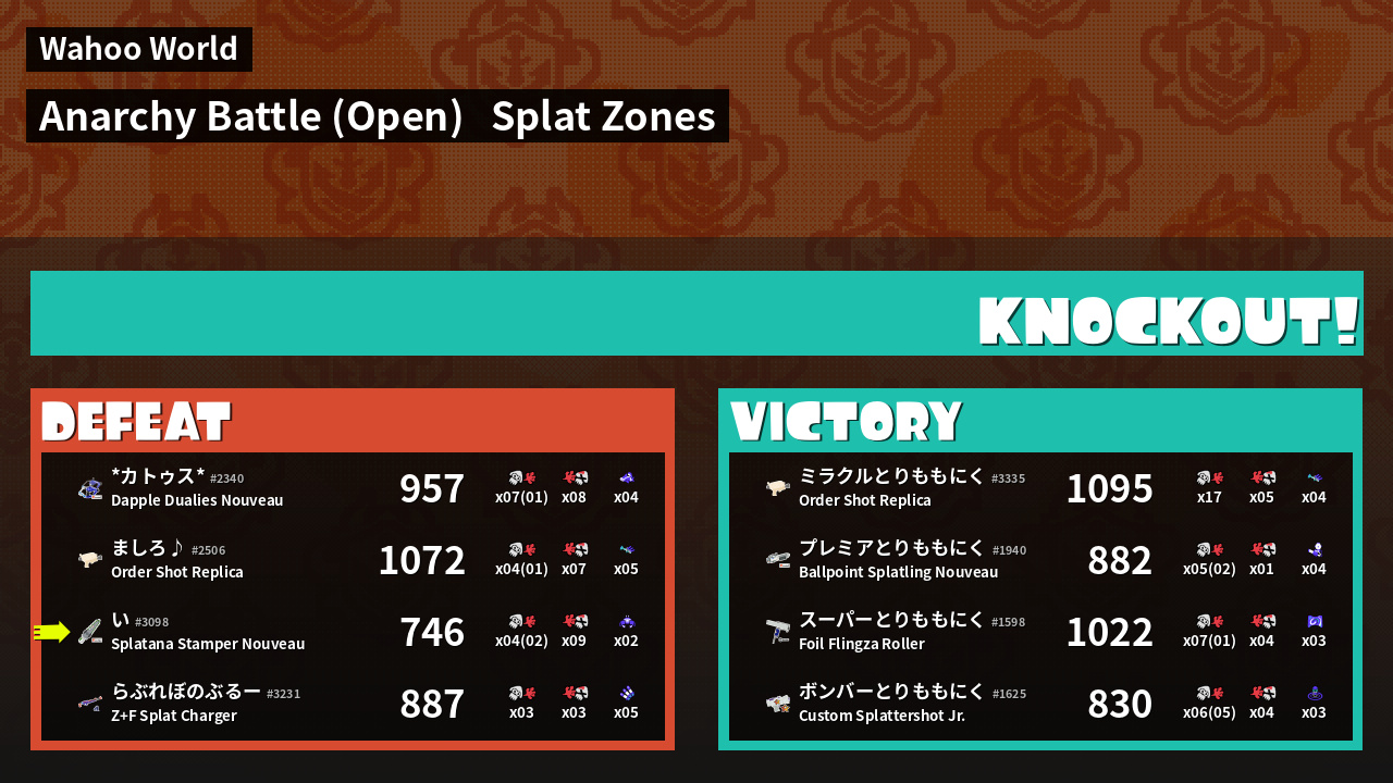 | 明日が楽しみなスルメ  い #3098 |  Splatana Stamper Nouveau                    | 746 | 2 + 2 | 9 | 0.22 |  2 | |