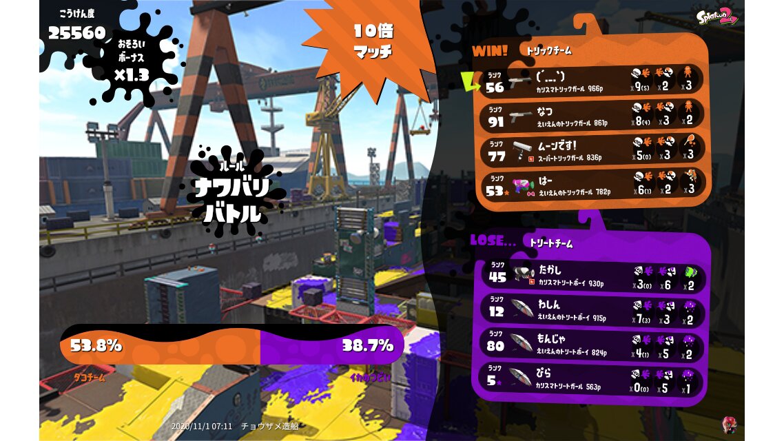 | Team トリート イカのつどい Win Streak: 0 | 3,232 | 10 / 19 | 0.53 34.48% | ||||