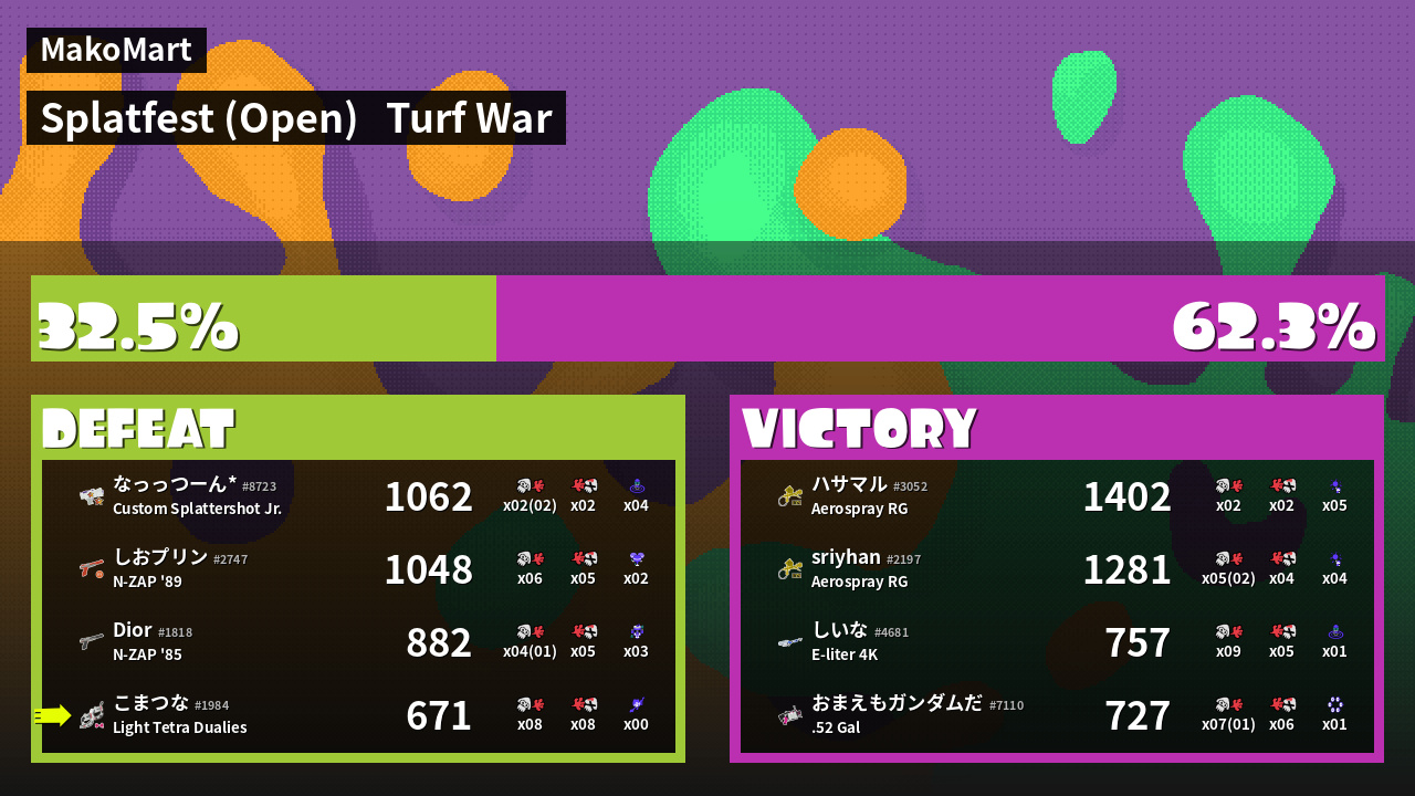 | Medals | #1 Overall Splatter #1 Enemy-Base Inker #1 Enemy Splatter | ||