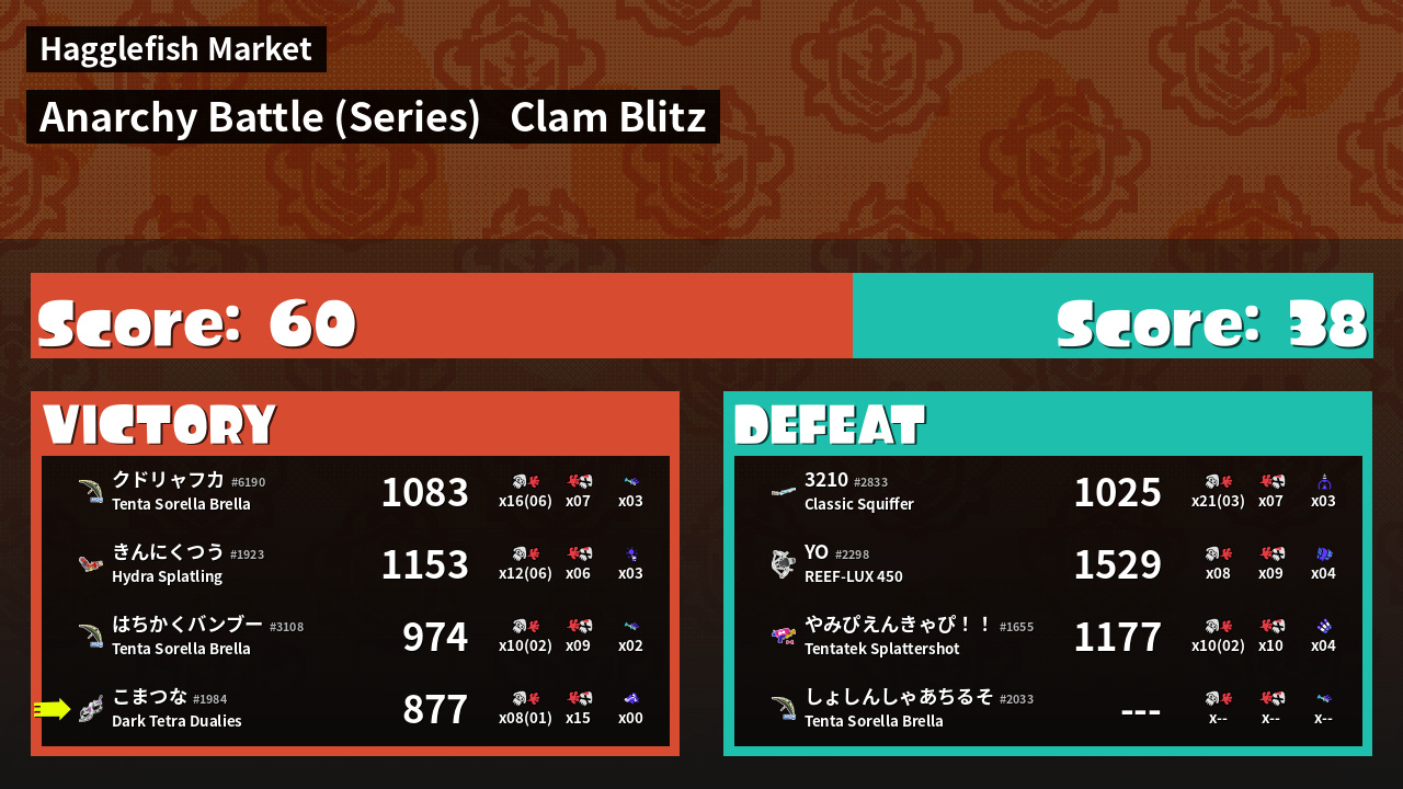 | バンカラな若者 きんにくつう #1923 |  Hydra Splatling                    | 1,153 | 6 + 6 | 6 | 1.00 |  3 | |