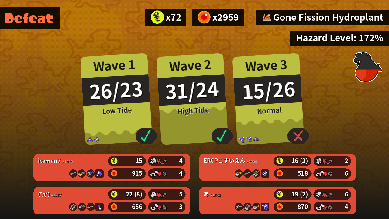 | Weapons | Snipewriter 5H Mini Splatling H-3 Nozzlenose | Splat Dualies H-3 Nozzlenose Snipewriter 5H | H-3 Nozzlenose Splat Dualies Mini Splatling | Mini Splatling Snipewriter 5H Splat Dualies |