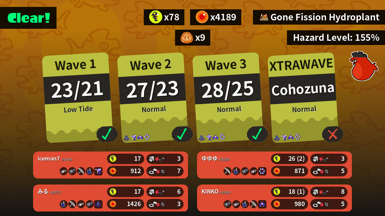 | Weapons |  .96 Gal  L-3 Nozzlenose  Splat Brella  Tri-Slosher |  Splat Brella  Tri-Slosher  L-3 Nozzlenose  .96 Gal |  L-3 Nozzlenose  .96 Gal  Tri-Slosher  Splat Brella |  Tri-Slosher  Splat Brella  .96 Gal  L-3 Nozzlenose |