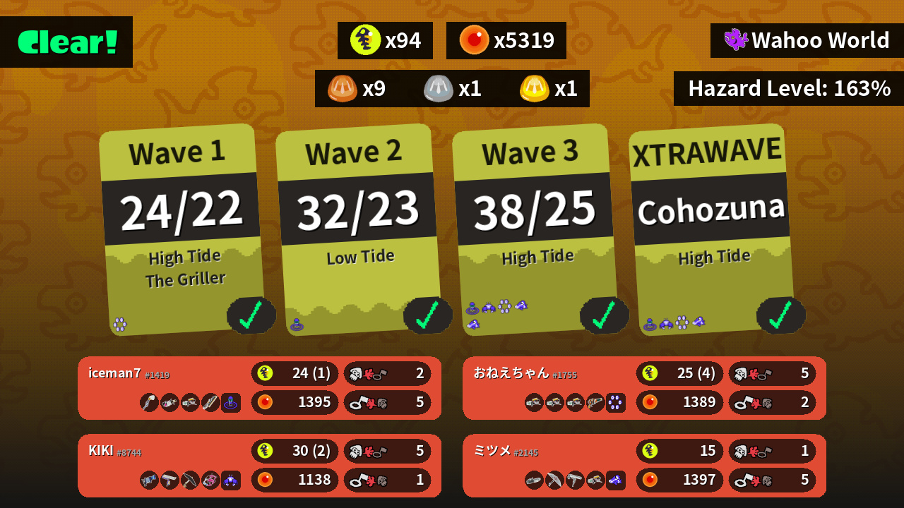 | Weapons | Inkbrush .96 Gal Grizzco Blaster Splatana Wiper | L-3 Nozzlenose Splat Roller Undercover Brella Dapple Dualies | Grizzco Blaster Grizzco Blaster Grizzco Blaster Squeezer | Ballpoint Splatling Splat Brella Dynamo Roller Grizzco Blaster |
