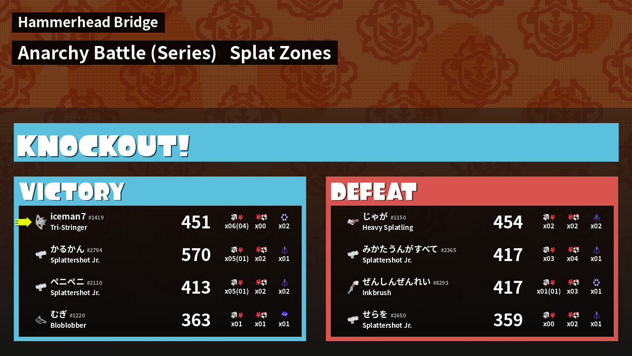 | 北極海の赤ちゃん みかたうんがすべて #2365 |  Splattershot Jr.     | 417 | 3 + 0 | 4 | 0.75 |  1 | |