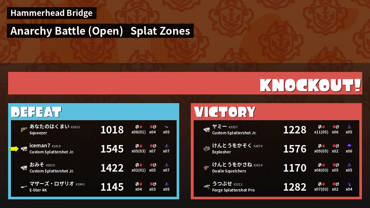 | ハイカラシティの思い出 iceman7 #1419 |  Custom Splattershot Jr.                    | 1,545 | 2 + 3 | 7 | 0.29 |  7 | |