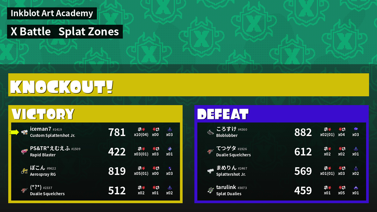 | 甘党のカルパッチョ iceman7 #1419 |  Custom Splattershot Jr.                    | C- | 781 | 6 + 4 | 0 | 99.99 |  3 | |