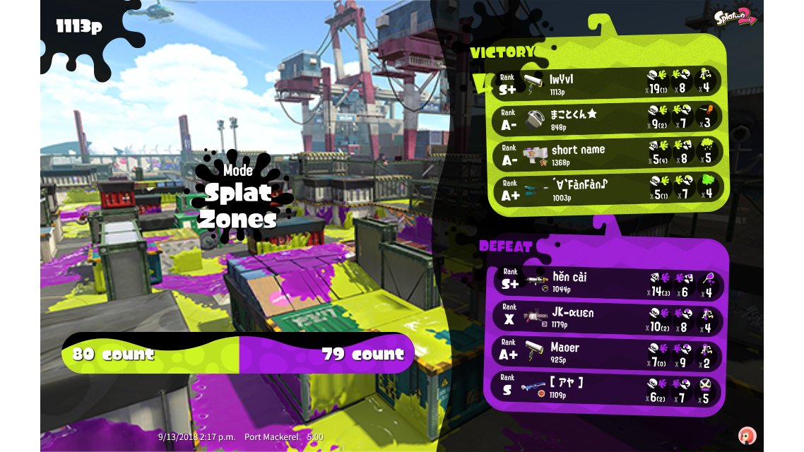 | Mode | Splat Zones - Private Battle | ||||||||||||||||||||||||||||